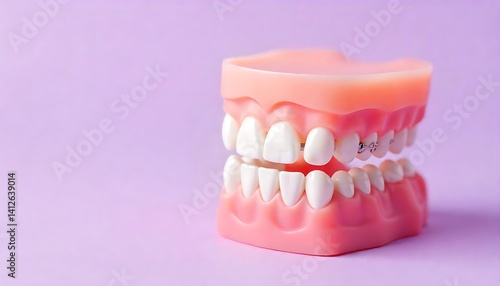 Fototapeta premium 3D model of teeth with orthodontic braces, isolated on a pastel purple background, created with generative ai
