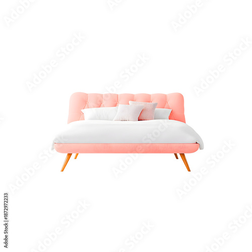 Fototapeta premium 3D Modern Pink Tufted Bed with White Bedding and Mid-Century Wooden Legs