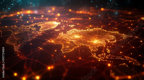 © Thirakun, Fototapeta premium 3D network connections with vibrant lights and global data visualization