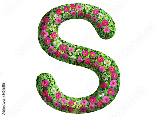 © rozi, Naklejka premium 3d of alphabet S, design made from flowers, leaves and green grass on transparent background