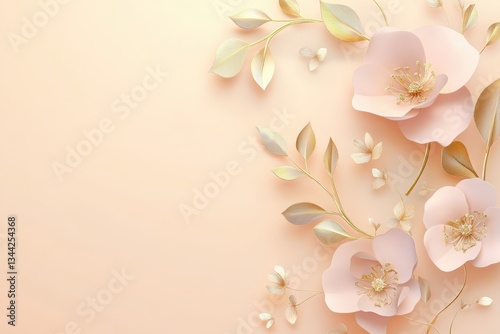 © An Amanita, Naklejka premium 3d paper cut Eglantine flower branches on pastel background. Wedding invitations, greeting cards, wallpaper, background, printing, poster, social ads, banner