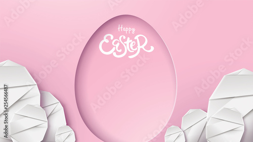 Obraz premium 3d paper cut illustration of easter rabbit, grass, flowers and egg shape. Happy easter greeting card modern template. - Vector