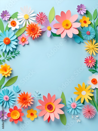© Janos, Naklejka premium 3D paper cut spring flowers border on a light blue background