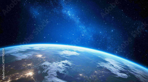 Fototapeta premium 3D planet earth in space universe with shiny star dark blue technology science background with copy space. astronomy starry sky shimmering glow wallpaper