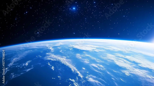 © Ashy studio, Obraz premium 3D planet earth in space universe with shiny star dark blue technology science background with copy space. astronomy starry sky shimmering glow wallpaper