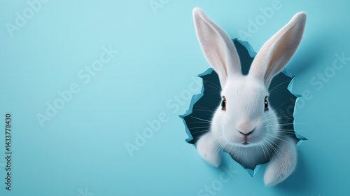 © ZaheerUDin, Obraz premium 3D rabbit head breaking through blue wall with copy space