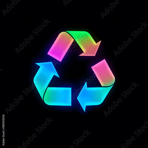 Fototapeta premium 3D recycling symbol glowing neon rainbow multicolor gradient black background environment conservation waste management
