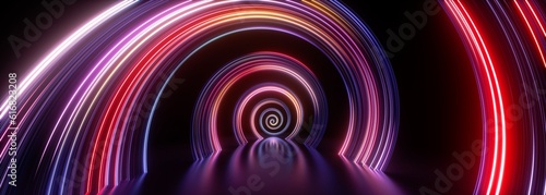 © NeoLeo, Naklejka premium 3d render. Abstract neon background of perspective view of spiral tunnel and glossy floor reflection