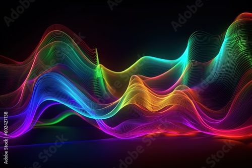 © Parvez, Naklejka premium 3d render, abstract pink blue neon background with wavy line glowing in ultraviolet spectrum, Generative AI