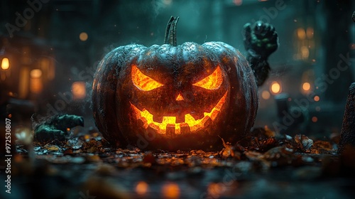 Naklejka premium 3d render curse3d tomb magical pumpkin with angry face and green light jack lantern and scary green zombie arms show out of the ground in front of the grave stone halloween illustration