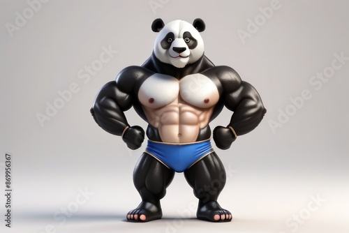 Fototapeta premium 3D render depicting a muscular bodybuilder panda bear at the light grey backdrop.