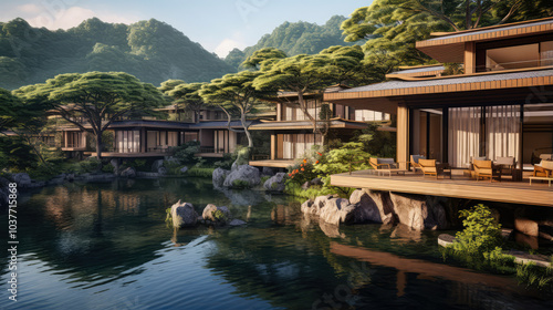 © Nuchjara, Obraz premium 3D render, Exterior design concept, Japanese Resort by the Natural background
