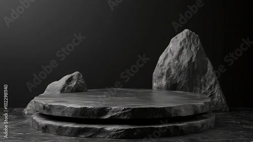 © Kultivad, Naklejka premium 3D render illustration of stone and rock shapes Round podium and pedestal for product display Solid dark black color Mockup template for advertising design