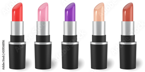 © Kakabe, Obraz premium 3d render lipstick variety Colorful Tones tints palette pink, wine, vinous, mockup design isolated on white background with clipping path. Beautiful Make-up concept. "3d illustration"