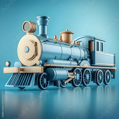 © Siasart Studio, Naklejka premium 3D Render of a Blue and Wood Toy Train on a Blue Background, Detailed Model with Wheels and Realistic Texture