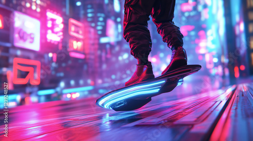 © Oleksandr, Obraz premium 3D render of a futuristic hoverboard gliding over a neon-lit cityscape.