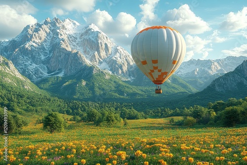 © YUANCEN, Naklejka premium 3D render of a hot air balloon flying over a green meadow with yellow flowers and mountains in the background, high resolution, high detail.