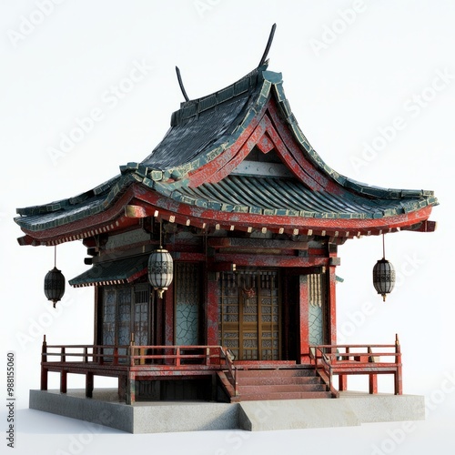 Obraz premium 3D Render of a Japanese temple with intricate roof tiles and hanging lanterns, on isolated white background