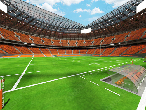 © Danilo, Obraz premium 3D render of a round rugby stadium with orange seats and VIP boxes