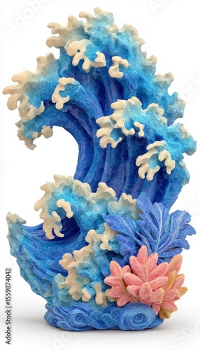 Obraz premium 3D Render of a Textured Blue Wave with Coral Accents on White Background