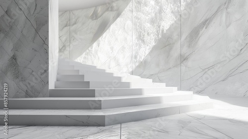 © Mahmud, Fototapeta premium 3D render of an abstract white background featuring natural architectural stone textures. The scene includes an empty space background pattern with a conceptual wall and a platform.