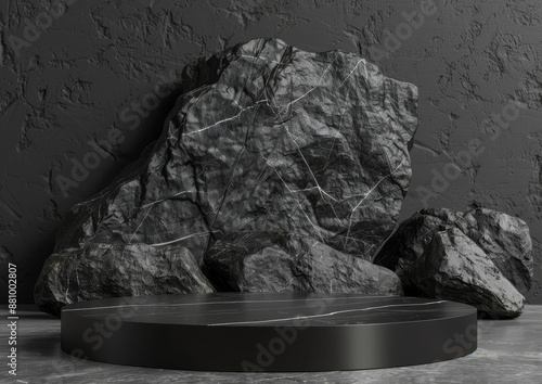 © IQRAMULSHANTO, Naklejka premium 3d render of black stone podium with rock background