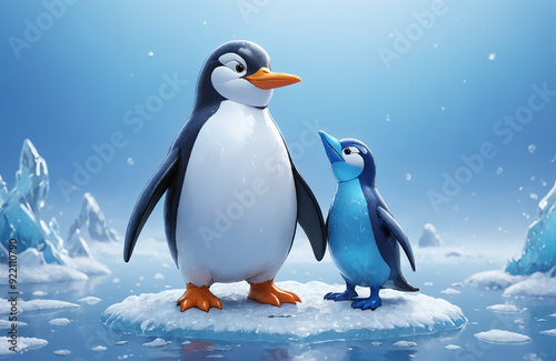 © Ken, Obraz premium 3d render of cartoon penguin in realistic ice background