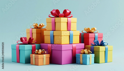 © Юлия Васильева, Obraz premium 3d render of colorful gift boxes with ribbons on blue background