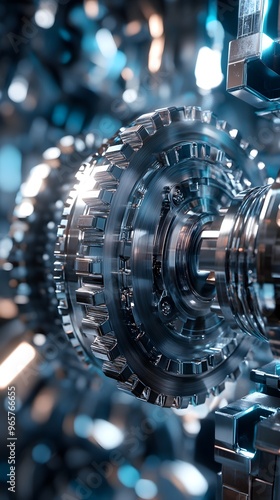 © Shyamal, Fototapeta premium 3D render of complex mechanical gear with a tech backdrop