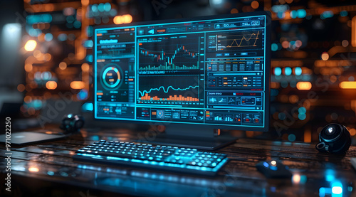 © Maya Crafta, Obraz premium 3D Render of Computer Screen with Data Visualization