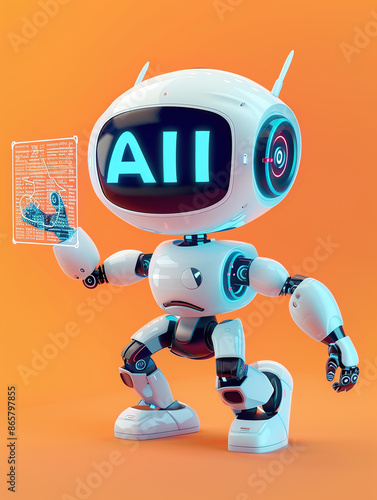 © 沈军 贡, Fototapeta premium 3d render of cute robot holding digital glowing hologram with text "AI" on it, orange background