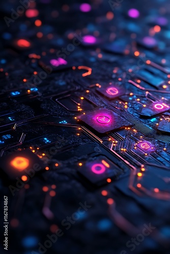 © Akash, Fototapeta premium 3D render of digital technology interface with floating neon symbols and lines