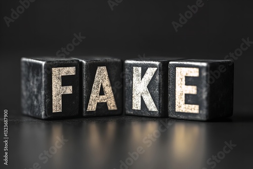© naim, Obraz premium 3D Render of 'FAKE' on Black Matte Cubes with White Letters – Dark Elegant Background