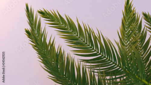 © Ivan, Naklejka premium 3d render of green palm leaves on blue background. Foliage with the depth of field.