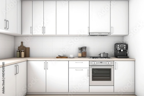 © dhdd, Fototapeta premium 3d render of minimalist white kitchen cabinet with coffee machine on one side and oven in center, front view against white wall background