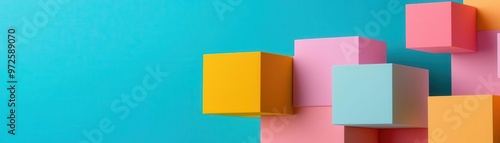 © JAYDA RIN, Fototapeta premium 3D render of multicolored blocks floating in space, sharp lighting, and vivid colors, giving a playful yet modern feel geometric blocks, playful