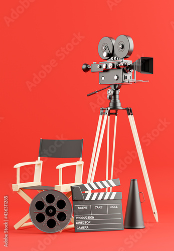 Obraz premium 3d render of retro movie camera with reel film, clapper board, director Chair, megaphone