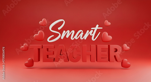 © Tahir Ayoub, Naklejka premium 3D Render of Smart Teacher Text with Red Hearts on Red Background for Teacher Appreciation, Valentine’s Day Greeting Card and Celebration Design