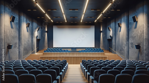 © visoot, Fototapeta premium 3d render of the university auditorium, minimalistic style, many seats, white and dark blue colors, wooden floor, view on the board screen. Generative AI.