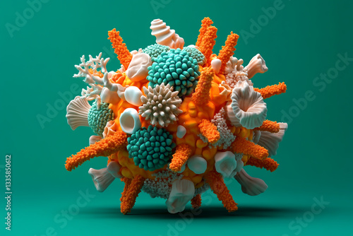 © Nasim Reza, Fototapeta premium 3D render of the virus with corals, shells, and mushrooms on it