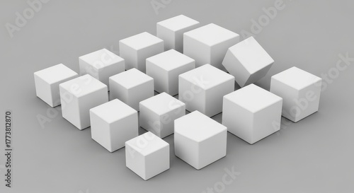 © Biggy, Fototapeta premium 3D Render of Various Sizes of White Cubes on a Light Gray Background for Abstract Concept