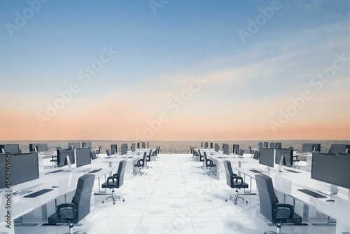 © vectorfusionart, Obraz premium 3D render showing white desks with black monitors and chairs floating on marble platform over sea