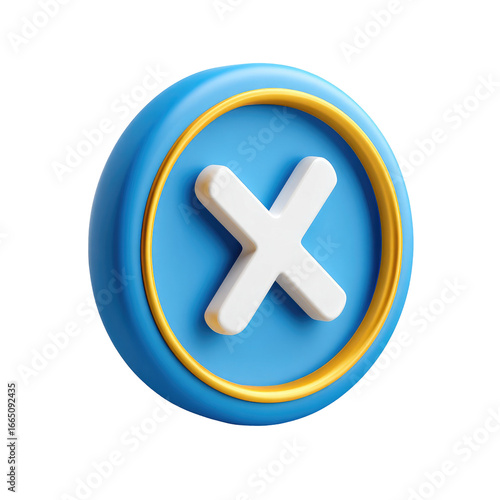 © Onigiri, Fototapeta premium 3D rendered blue button with a white 'X' symbol. A round, light-blue button has a golden, slightly raised ring around it. A large, white 'X' is centered on the button