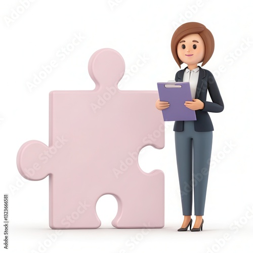 © Raitalinn, Obraz premium 3D Rendered Cartoon Businesswoman Standing Next to a Puzzle Piece in Upscale Professional Setting