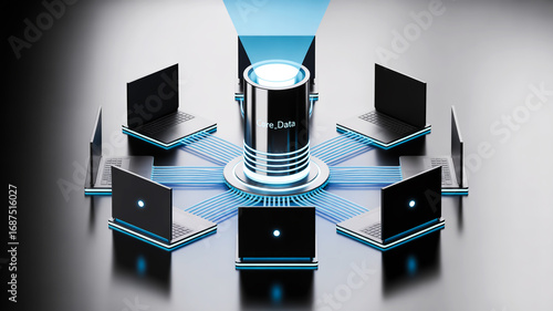 © MdMEJANOOR, Obraz premium 3D rendered star network, blue central database, six black clients