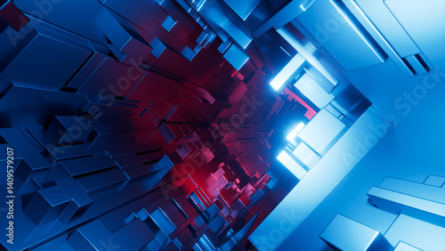 Fototapeta premium 3D rendering. Abstract geometric background, complex metal construction illuminated with blue and red neon light