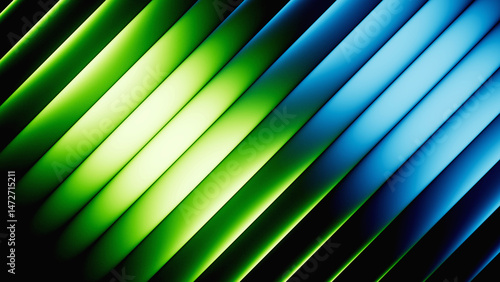 © NeoLeo, Fototapeta premium 3d rendering. Abstract minimalist geometric background. Diagonal metallic texture with blue green gradient. Ribbed glass illuminated with neon light