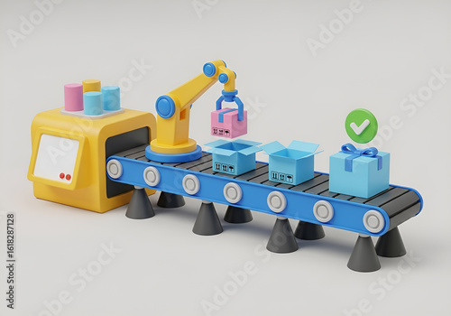© Tahamina, Fototapeta premium 3d rendering conceptual image 3d illustration of a cartoonstyle factory production line with a robot arm placing gifts onto a conveyor belt
