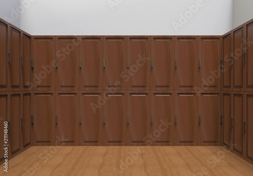 © PATARA, Fototapeta premium 3d rendering. dark brown wooden locker row wall background.