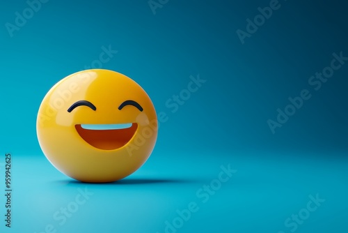© Andrei, Fototapeta premium 3D Rendering, Happy Yellow Emoji with a Wide Smile Isolated on a Minimalist Blue Background